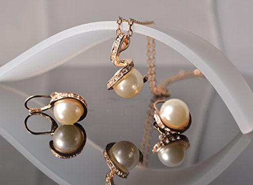 Imitation pearl pendant necklace and matching earrings set studded with swarovski elements gems, metal type - 18k rose gold plated