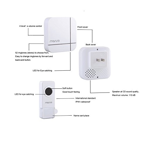52 different ring tones. 4 levels of adjustable volume from 30db to 110db. Simply plug receiver into a power supply AC 110V. The transmitter button remote battery (12V 23A ALK battery) is included.