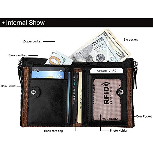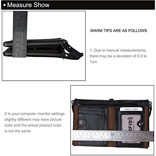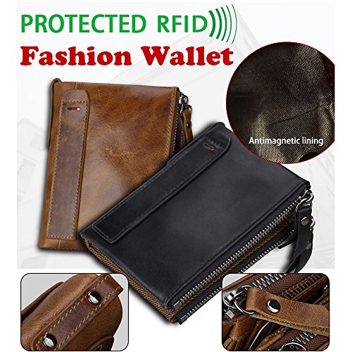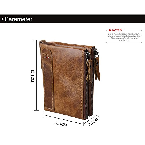 -. Feature : DIMENSION: INCH 4.8" x 3.7" x 1.1", this is a wallet fit for most front pockets, easy to carry. / BLOCK UNWANTED RFID SCANNERS: RFID BLOCKING DESIGN: - The RFID protection card holder can perfectly block unwanted RFID scanners, to protect your personal information, like ID Card, Credit Card, it is really necessary when walking out. / MEN'S GENUINE LEATHER WALLET: 100% genuine hand-crafted retro cowhide leather, soft and comfortable. The lining was made of polyester, smooth and durable. / MINIMALIST & LOTS OF STORAGE WALLET: 5 card slots, 3 inside slots, 1 ID window, 2 Purse Slots, 2 long slots. allow for quick access when traveling or at the store /working place. lots of storage durable enough / UNIQUE TEXTURE FEATURES: As genuine cowhide leather wallet, have natural special scratches, it will become brighter and brighter over time.