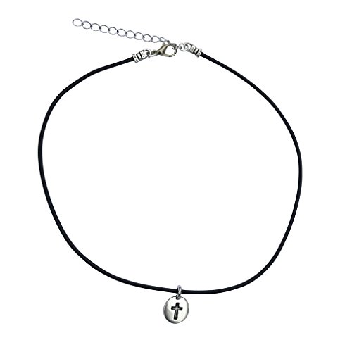 Petite cross charm jewelry set of matching choker necklace and earrings, made of silver plated pewter that is antique finished to give it a worn look. Features a simple cross etched into a circle charm, oxidized to bring out the design. The cross charm is approximately 2/3" (17mm) long and 1/2" (12mm) across.