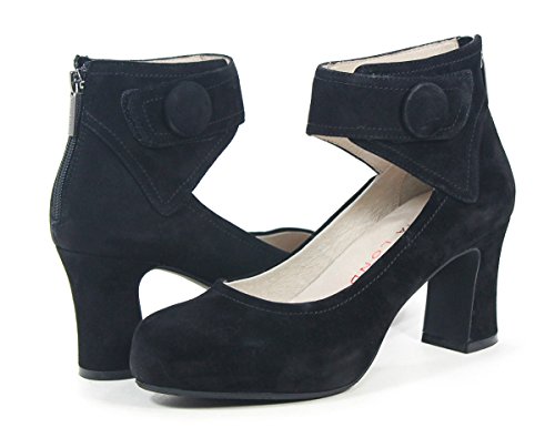 -. Feature : Soft, smooth suede upper. Stylish velcro ankle strap with button detailing. Back zip closure. / Leather lined interior. Cushioned footbed for added comfort. / 2" suede wrapped heel. / Color: Black / Heel Height: Med (1 3/4 in. to 2 3/4 in.)