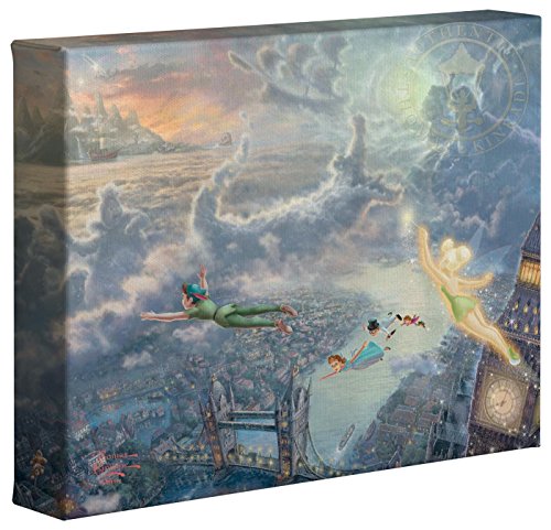 As with the first two paintings in my twelve piece Disney Dreams Collection (affectionately referred to as the "Disney dozen" by die hard collectors!), I try to tell the whole story in a single image - what I refer to as a "narrative panorama". We see Neverland in the distance, just below the "second star to the right", as the full moon bathes the scene with its silvery glow. The lights of London twinkle along the river Thames, as the clouds take shape, if only in our imagination, as characters from the adventure - Captain Hook, Smee, the Lost Boys and the ubiquitous ticking crocodile. But for me, the central character of the story will always remain Tinker Bell, the enchanted fairy princess who makes the entire journey of imagination possible. -Thomas Kinkade