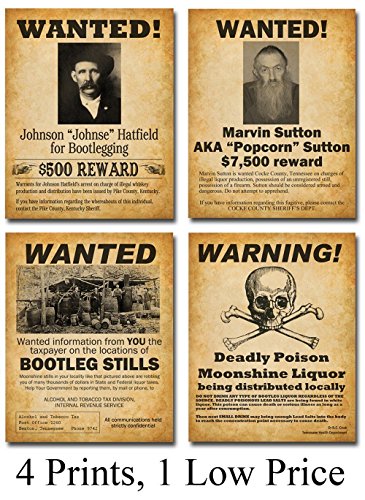 Bring a little whimsy to your household. These four prints show vintage style wanted posters and warnings against bootleggers. The original patent artwork has been reinterpreted by award winning artist Norm Lanier.