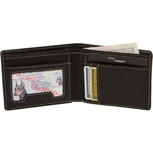 -. Binding : Apparel -. Brand : Access Denied -. Department : mens -. Feature : RFID Blocking Technology Throughout / Slim Durable Tactical Ballistic Nylon with Genuine Leather Trim / 2 Card Slots, ID Window, large card pocket, 2 slip pockets, and dual currency compartment / Gift Boxed / Dimensions: 4.25" x 3.5" x .5" -. ProductGroup : Apparel -. ProductTypeName : ACCESSORY -. Size : One Size -. Title : Access Denied Mens Leather Tactical Ballistic Nylon wallet with RFID Blocking