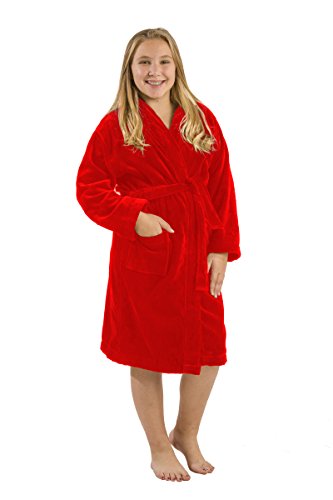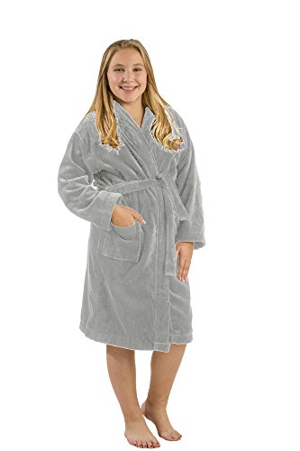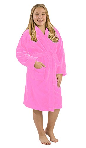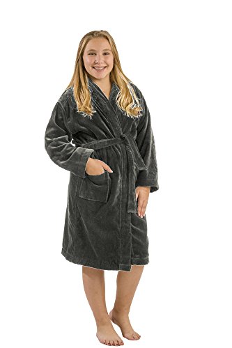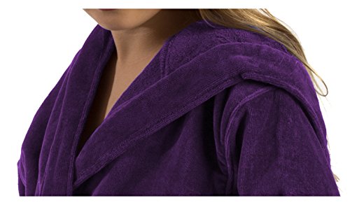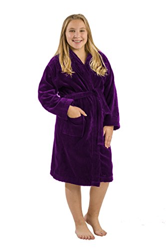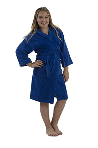 Our model wears Large size hooded terry bathrobe. She is 11 years old. Terry cloth robe made of 21 single 2 ply ring spun yarn cotton. Loop terry on the interior and triple sheared velour terry cloth on the exterior for boys, girls, teenagers and petites. Thick luxurious cotton robe keeps you warm all winter long. It's water absorbent and exceptionally soft against the skin, a little luxury to slip on after showering or anytime. Generously sized. Machine washable.