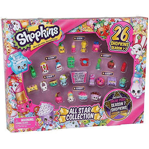 -. Feature : 26 Shopkins- Assorted / 1 Collector's guide / Contains All Stars from seasons 1, 2, 3, 4, 5 and 6 / Contains exclusive glitter Shopkins / Includes 2 Sneak Peek Season 7 Shopkins