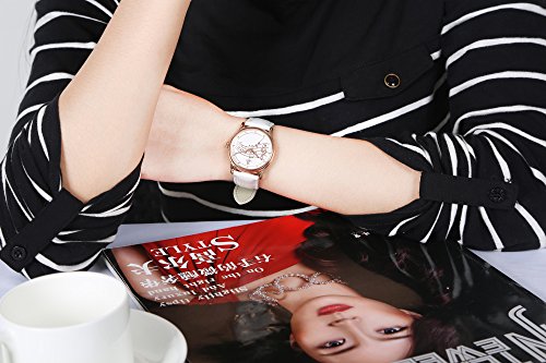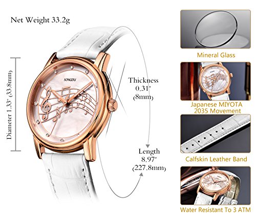 -. Feature : 1. Japanese MIYOTA 2035 quartz movement; Analog display. / 2. White mother pearl dial; Protective mineral glass. / 3. Rose gold stainless steel case; Music theme design with crystal rhinestones. / 4. White leather strap with crocodile texture with buckle; Water resistant 3 ATM; Net weight: 33.2g / 5. WARRANTY: 30 Days money back guarantee; Friendly customer service within 12 hours; PACKAGE: 1x SONGDU Watch, 1x gift box, 1x User Manual.