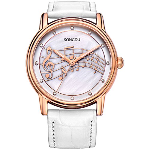 -. Title : SONGDU Women Mother Pearl Dress Watches Music Note Diamond Rose Gold Bezel White Leather Strap