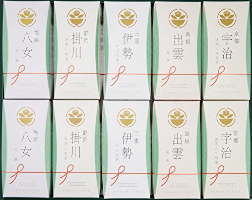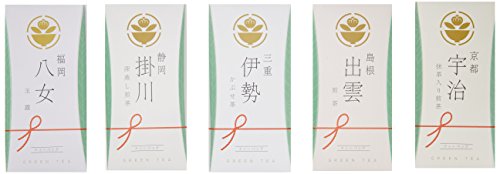 原材料:福岡 八女玉露ティーバッグ(3g×5p)×2、京都 宇治抹茶入煎茶ティーバッグ(4g×5p)×2、静岡 掛川深蒸し煎茶ティーバッグ(5g×5p)×2、三重 伊勢かぶせ茶ティーバッグ(5g×5p)×2、島根 出雲煎茶ティーバッグ(5g×5p)×2