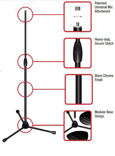 -. Feature : Patented mic attachment with top threads that fit U.S. and metric threaded mic clips and accessories / Heavy-walled oversized steel tubing / Secure rubber footcaps / Parts are interchangeable and field replaceable / Heavy-duty chrome finish