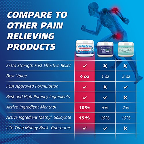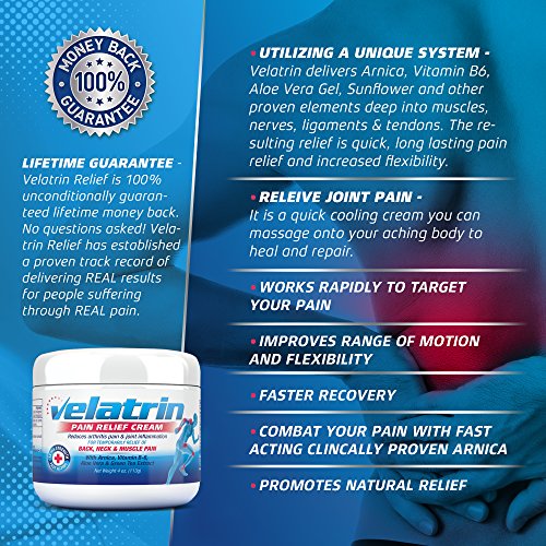 -. Feature : WORKS RAPIDLY TO TARGET YOUR PAIN: Immediate, Lasting, Cooling Relief For Arthritis, Neck & Back Pain , Golf & Tennis Elbow, Tendonitis, Bursitis, Sciatica, Back Pain, Shin Splints, Neuropathy, Fibromyalgia, & Plantar Fasciitis. / IMPROVES RANGE OF MOTION AND FLEXIBILITY. When you're in pain your movement is constrained preventing you from enjoying the day. Rexigen Relief quickly relieves joint and muscle discomfort so you can move freely and easily / FASTER RECOVERY: Post-workout remedy for soreness and discomfort. Athletes find it effective as a complementary application with braces, splints, gloves, ultrasound treatment, physical therapy, and deep tissue massage. / COMBAT YOUR PAIN WITH FAST ACTING CLINCALLY PROVEN ARNICA: Velatrin Relief contains high concentrations of Arnica, a powerful anti-inflammatory that worked just as well as daily ibuprofen, and with minimal side effects. / PROMOTES NATURAL RELIEF. Velatrin Relief is a natural, side effect free cream. You'll experience similar temporary pain relief without any of the unwanted side effects.