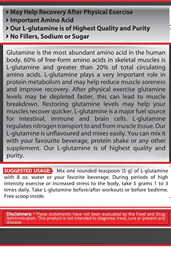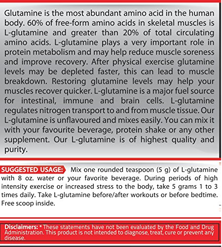 Glutamine is the most abundant amino acid in the human body. 60% of free-form amino acids in skeletal muscles is L-glutamine and greater than 20% of total circulating amino acids. L-glutamine plays a very important role in protein metabolism and may help reduce muscle soreness and rebuild muscle tissue. Studies show that after an intense workout, glutamine levels drop by 50% and can take up to six days to recover. During this time, you may be losing lean muscle and strength. Restoring glutamine levels helps your muscles recover quicker. L-glutamine promotes the assimilation of nutrients, regulates protein synthesis and enhances the immune system. L-Glutamine is a major fuel source for intestinal, immune and brain cells. L-Glutamine regulates nitrogen transport to and from muscle tissue. Our L-Glutamine is unflavored and mixes easily. You can mix it with your favorite beverage, protein shake or any other supplement. Our L-Glutamine is of highest quality and purity. Key benefits: ? May Help Recovery After Physical Exercise ? Important Amino Acid ? Our L-Glutamine is of Highest Quality and Purity ? No Fillers, Sodium or Sugar 0 |