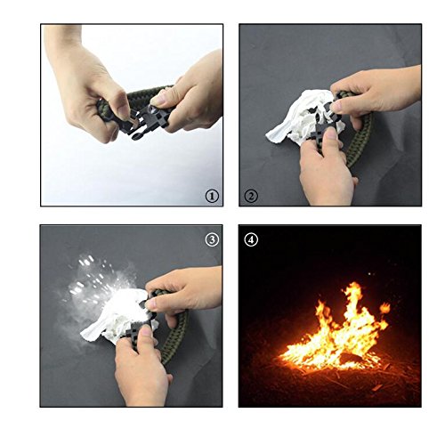5 in 1 function. Fire starter, Stainless Steel Scraper, Paracord ,Whistle and Mini Compass.