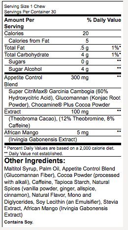 -. Binding : Health and Beauty -. Brand : NLA for Her -. EAN : 0701385375683 -. Feature : Naturally flavored rich chocolate advanced appetite suppressant support / Gluten free / Contains 0 g of sugar / Naturally sweetened / Only 20 calories per chew -. IsAdultProduct : 0 -. Label : Lone Star Distribution -. LegalDisclaimer : Excessive consumption may have a laxative effect. -. Manufacturer : Lone Star Distribution -. Model : 8210014 -. MPN : 4170588806 -. NumberOfItems : 1 -. PackageQuantity : 1 -. PartNumber : 4170588806 -. ProductGroup : Health and Beauty -. ProductTypeName : HEALTH_PERSONAL_CARE -. PublicationDate : 2016-01-17 -. Publisher : Lone Star Distribution -. ReleaseDate : 2016-01-14 -. Studio : Lone Star Distribution -. Title : NLA For Her Appetite Control Performance Chew, Rich Chocolate, 30 Count -. UPC : 701385375683