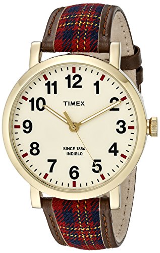 -. Feature : Gold-tone round watch with Arabic numerals, red hour markers, and Indiglo nightlight / 42 millimeter stainless steel case with mineral dial window / Quartz movement with analog display / Plaid fabric band with leather trim and buckle closure / Water resistant to 99 feet