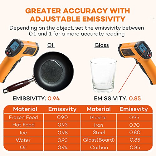 Greater Accuracy with Adjustable Emissivity Nearly every object emits an infrared energy, which indicates the temperature of an object. In order to provide a more accurate reading, the infrared thermometer can set the emissivity level from 0.1 to 1. Unlike other temperature measuring guns, enjoy MAX, MIN, DIF, AVG modes for improved accuracy and more feedback.