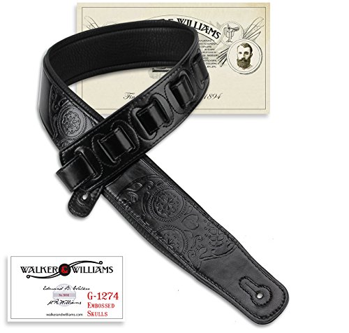 -. Brand : Walker & Williams -. Color : black -. EAN : 0736024415796 -. Feature : Premium Quality Handmade Strap For Guitar or Bass / Polished Black Top Welt with Sugar Skulls Design / Ultra Comfortable Padded Black Glovesoft Back / Double Reinforced End Caps / 2.75" Wide and Adjustable From 44"-54" -. Label : Walker & Williams -. Manufacturer : Walker & Williams -. Model : GM-1274 -. MPN : GM-1274 -. PackageQuantity : 1 -. PartNumber : GM-1274 -. ProductGroup : Musical Instruments -. ProductTypeName : INSTRUMENT_PARTS_AND_ACCESSORIES -. Publisher : Walker & Williams -. Studio : Walker & Williams -. Title : Walker & Williams GM-1274 Padded Black Guitar Strap with Double Skulls -. UPC : 736024415796