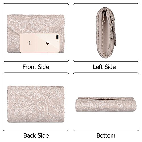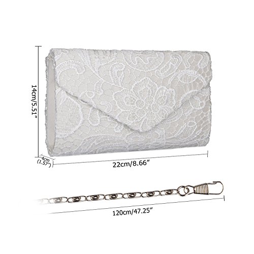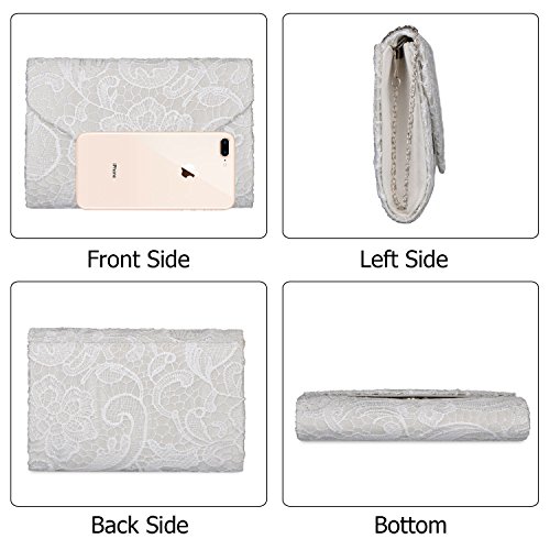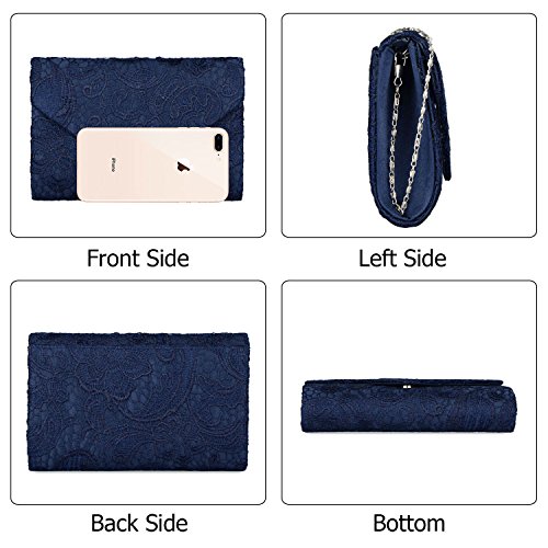 Product Description Features: Size: 8.6"(L) *1.58"(W) * 5.51"(H) Material: soft satin lace Compartment: one main compartment one small pocket Closure type: magnetic closure Occasions: wedding/prom/party/black tie/show/cocktail/night out Fit enough: cell phone/small wallet/mirror/lipstick/makeups/cash/credit card/car keys