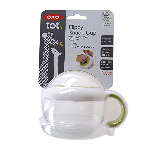 -. Binding : Baby Product -. Brand : OXO -. Color : Green -. Department : baby-boys -. EAN : 5055622231566 -. Feature : Soft, comfortable flaps provide easy access to snacks / Flaps keep snacks in the Cup and off the floor / Twist on lid won't pop off, even when Cup is dropped / Travel cover snaps on to keep snacks contained while on the go / Non slip handle conveniently hooks onto strollers and is easy for little hands to hold -. Label : OXO -. Manufacturer : OXO -. Model : 6114100 -. MPN : 6114100T1UK -. NumberOfItems : 1 -. PackageQuantity : 1 -. PartNumber : 6114100T1UK -. ProductGroup : Baby Product -. ProductTypeName : BABY_PRODUCT -. Publisher : OXO -. ReleaseDate : 2012-01-01 -. Size : NO SIZE -. Studio : OXO -. Title : OXO Tot Flippy Snack Cup with Travel Lid - Green -. UPC : 719812931418