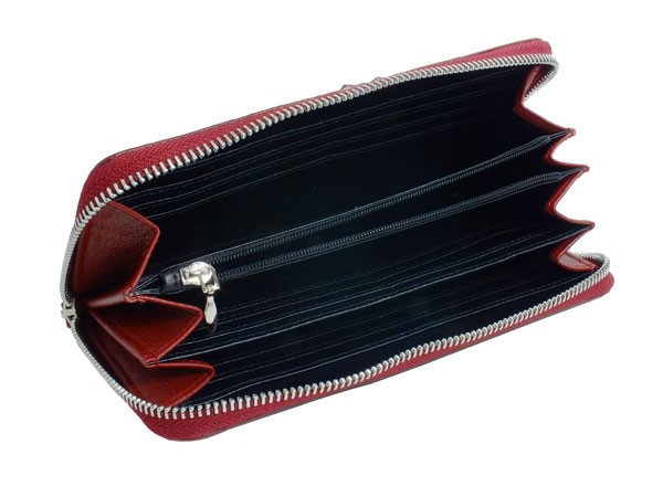 開閉:ファスナー、外側:ポケット×1、内側:札入れ×2、ファスナー式小銭入れ×1、カードポケット×18、オープンポケット×3、カラー:ワインレッド