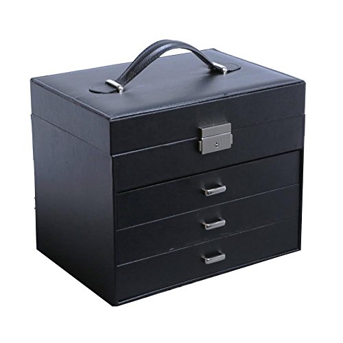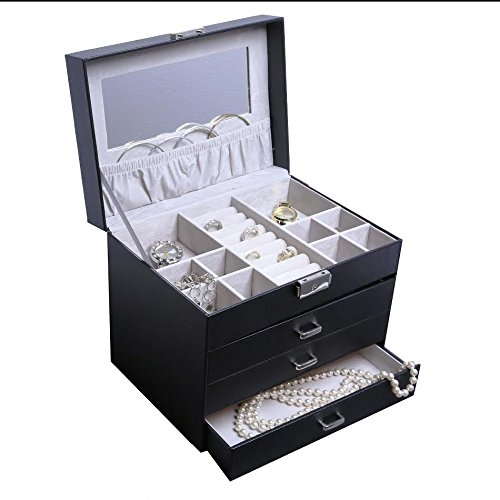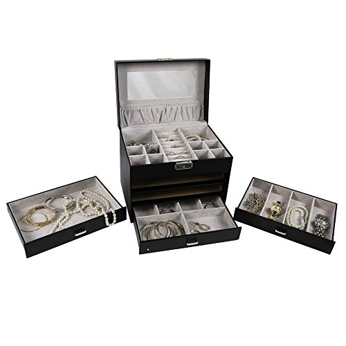 -. Feature : Store your jewelry in style with this beautiful leather jewelry chest. You'll have spacious storage for organizing all of your jewelry and trinkets. / The jewelry box's rich finish and genuine leather is a luxurious addition to any decor. Suede interior to protect the delicate jewelry. / Features, 2 large and 8 small compartments, a large storage pouch, and a ring case to keep rings stored uP.R.Ight. / With the 3 pull out drawers offering tons of storage room, and a mirror which makes it easier to dress, the jewelry box is sure to meet all your needs. / Secure the lid using the provided push and snap closure. Overall box dimensions 10.25" x 7.25" x 8.5".
