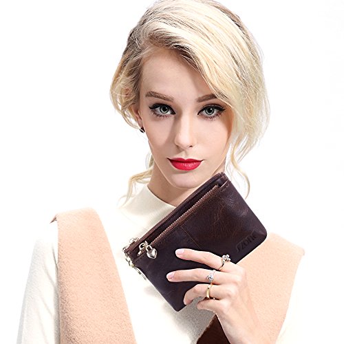 Structures: 5.2*3.6*0.4inch (L*H*W); Weight: 0.18lb. Compact enough for holding in your pocket or purse. Contains 3 zipped pockets and a card holder in the main compartment make it easier to find what you need quickly. Adequate spaces for holding seven cards or coins small changes. Materials: Made of advanced cow leather with wax finish, feels luxury and comfortable. It comes with golden metal zipper and sleek lining.