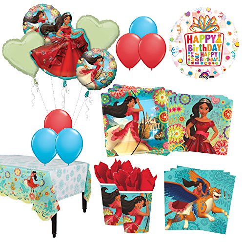 -. Feature : (1) 5 Piece P.R.Incess Elena of Avalor balloon Bouquet: (1) 31" P.R.Incess Elena of Avalor Jumbo Foil Balloon, (2) 18" Round P.R.Incess Elena of Avalor Foils and (2) 19" Leaf Green Heart Foils / (1) 26" BDAY PRESENT PARTY SEE-THRU balloon / (16) 9" sq P.R.Incess Elena of Avalor plates - (16) 7" sq dessert plates / (2) P.R.Incess Elena of Avalor - Table Cover - (16) P.R.Incess Elena of Avalor - 9 oz Cups / (32) P.R.Incess Elena of Avalor - Lunch Napkins - (6) 11" Latex Balloons 3- Turquoise and 3- Red. Dinnerware by Amscan and Balloons by Anagram.