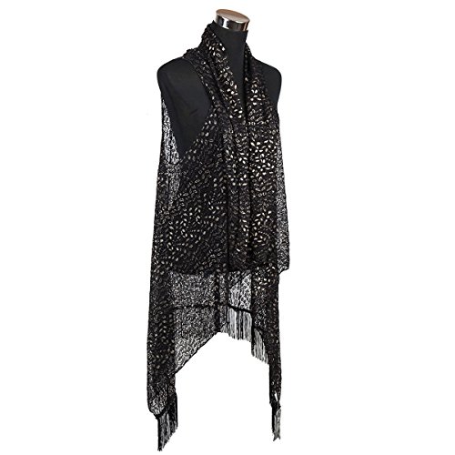 Binding : Apparel Product Description This airy vest, is a beautiful addition to a spring or summer day, whether in the park or at the beach, it can work as a cover up or just to add dashing accents to a evening outfit. Hand wash only, no sleeves, it has an open front with no closures. Dimension: One size, 62" W x 41" L with tassels. Material: 100% polyester. Colors: Black and gold 0