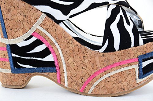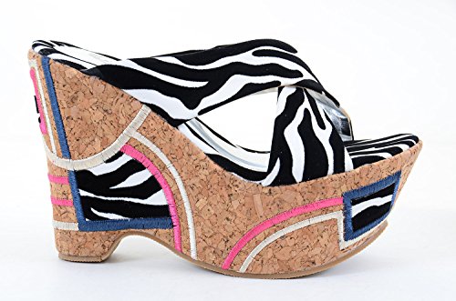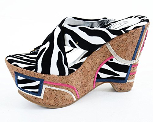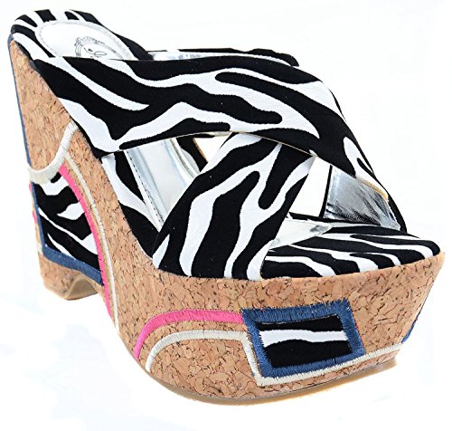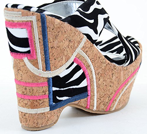 Binding : Apparel Product Description Funky and fun?! You got it! Take your design to another level with these high wedge platform slip-ons. Featuring a cork heel, leatheretter criss cross banded upper, stitching detail of pink, beige, blue and padded animal print insole. 0