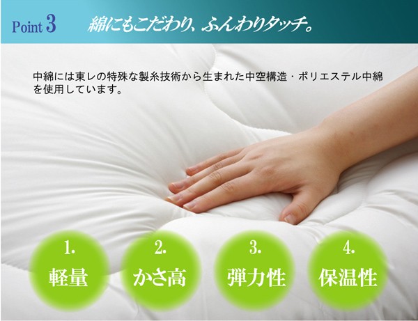 生地にマイガードを使用しています。マイガードは繊維と繊維の隙間が少ない高密度生地なので、ほこりの原因となる糸切れ、毛羽立ち、中綿の吹き出しを防ぎハウスダストを大幅に低減します。またダニの侵入を防ぎ、クリーンで快適な睡眠をサポートします。中わたには東レの特殊な製糸技術から生まれた中空構造・ポリエステル中わたを使用しています。特徴として1.軽量(わたの繊維が空気を包み込み軽くて快適。)2.かさ高(高度な中空率で優れたかさ高性を実現。)3.弾力性(ふんわりソフトで弾力性に優れています。)4.保温性(繊維一本一本の中に空気を含んで、暖かさをキープ。)5.羽毛タッチ(羽毛のように柔らかく弾力性に優れています。)6.ウォッシャブル(洗濯機で水洗い出来るので清潔に保てます。)などがあります。