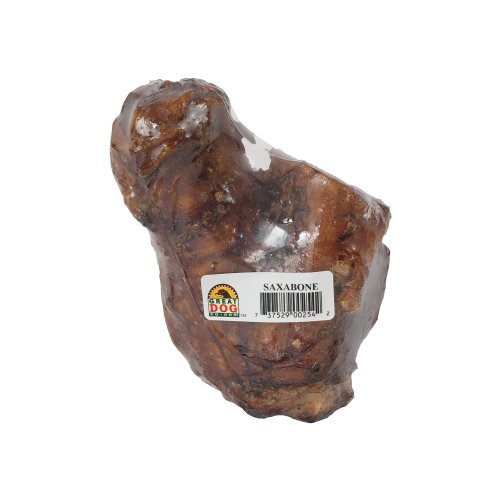 -. Feature : Great Dog Cow Saxabones got their name because of their saxaphone like shape, weigh in at approximately 1.75 pounds and are loaded with marrow, meat and fat tailings to provide extreme flavor, gnawing and chewing enjoyment / All natural and sourced from small Midwest family farms with less than 100 cattle / Cow Saxabones come from more mature, free-range animals resulting in the bones being larger than typical / Cow Saxabones are hock bones made up of 2-3 bones connected in meaty bits and connective tissue--larger bone will break apart into several pieces so aggressive chewers will be better suited to another type of GREAT DOG bone / Saxabones are slow roasted in a State 2 certified human grade facility, individually wrapped for freshness, and cooked without smokes, soaks, washes, nitrates, colorants, BHA or BHT