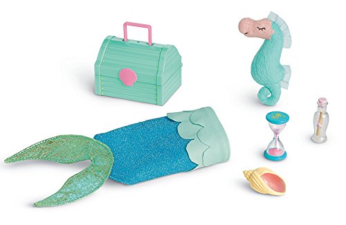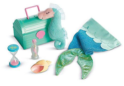 The set also includes a chest to hold a mermaid's special treasures: a tiny message in a bottle, an hourglass, a pretend seashell, and a seahorse pillow