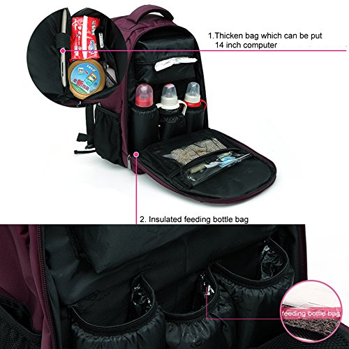 Description Bebamour Large Capacity Baby Diaper Bag Backpack Travel Backpack is not only a nappy changing bag, but also can be a travel bag. It is designed for parents in different demands. Perfect sewing is stronger for you. You can put much more daily essentials when you are outgoing.It have perfect department,1 main pocket, 1 zipper pocket, 1 mesh pocket, 3 insulated warm bottle bags, and some other pockets for you. There is 1 laptop compartment for you to put computer.