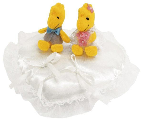 花婿と花嫁の衣装を身に着けた、ウッドストックのリングクッションです。ハート型のクッションでご結婚される人たちを祝福しています。