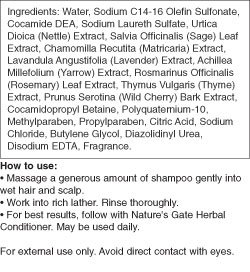 Studio : Nature's Gate Publisher : Nature's Gate Binding : Health and Beauty Product Description Our Herbal Shampoo gently cleanses hair with the perfect blend of herbs and botanicals. Sage, Lavender, Rosemary and Thyme purify and revitalize hair while Chamomile and Yarrow soothe and tone. With the nourishing benefits of our 7 Healthy Hair Nutrients, this shampoo is ideal for everyday use on all hair types, leaving hair soft and manageable.Exclusive healthy hair blend includes Panthenol, Soy Proteins, Vegetable Proteins, Jojoba Oil, Borage Flower Seed Oil, Vitamin C and Vitamin E.Panthenol (Vitamin B5) and Soy Proteins strengthen hair while adding shineVegetable Proteins condition and moisturize, helping to reduce the appearance of split endsBorage Flower Seed Oil, rich in essential fatty acids, promotes a healthy scalpVitamin C and Vitamin E work synergistically to provide antioxidant benefits 0
