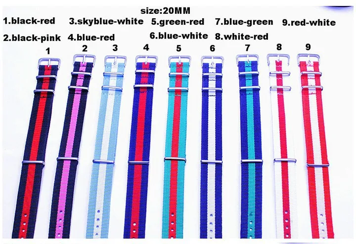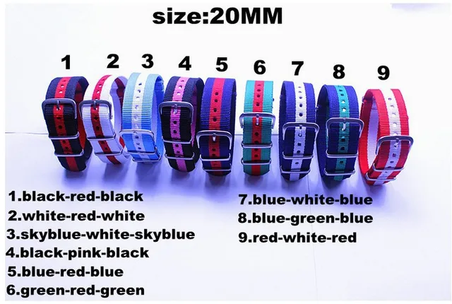 질문이, 저에게 연락 주시기 바랍니다 사용할 수 9-1 개 고품질 20 미리메터 나일론 시계 밴드 NATO 스트랩 방수 시계 스트랩 크기: 길이: 26.5 센치메터 폭: 20 미리메터 색상 임의 또는 메시지를 따라 배달