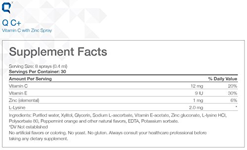 -. Feature : BEST VITAMIN C SPRAY Q C+ Vitamin C with Zinc spray plays an important role in nutrition and overall health and wellness. This Vitamin C spray supplement and multivitamin spray offers a powerhouse complex of Vitamin C antioxidant, Zinc, L Lysine, and Vitamin E. Our blend of Zinc vitamins, Vitamin E antioxidants, and Vitamin C aids in optimal calcium absorption. / BENEFITS OF Q C+ SPRAY Contains a compact formula of Vitamin C with Zinc that repels free radicals, helps with wounds, essential for enzymatic processes, helps maintain the release of Vitamin A, calcium absorption, and helps with treatment of cold sores. These are brain vitamins! Functions as a: Lysine supplement, Zinc throat spray, and Vitamin C liquid supplement. This Vitamin C with Zinc is 100% effective! / WHY Q C+ Vitamin C Spray? Our Vitamin C Spray and Zinc vitamin supplement provide addtional nutritional support and and has been formulated with the highest quality natural ingredients. Each tube contains approximately 30 servings (240 sprays)! Q Sciences is committed to providing the best products which is why we offer the best Vitamin C supplement on the web! / QUALITY ASSURANCE Manufactured in the USA. Our customers are our most important asset. / MONEY BACK GUARANTEE Try Q C+ Vitamin C Spray risk free with our 30-day money back guarantee. If you are not satisfied for any reason, return the product within 30 days for a full refund.