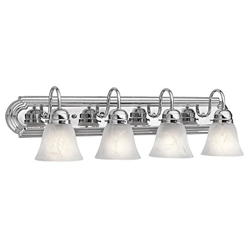 Kichler Lighting 5338CH Traditional 4LT Vanity Fixture features classic lines for a piece that will enhance your decor theme for many years to come with its quiet charm. The timeless Chrome finish complements Alabaster glass shades in a style that can be installed facing up or facing down. 5338CH is 30IN wide x 8IN high x 8IN extension. 5338CH comes one per package, and requires four 100W medium base incandescent bulbs (not included), dimmable using a standard incandescent dimmer. For an energy efficient alternative, medium base CFL or LED bulbs may be used, but might not be dimmable. Since 1938, Kichler Lighting has offered a distinctive array of lighting solutions that reflect your individual personality, tastes and plans. Kichler brings you an unparalleled variety of exciting style families, unique finishes, fresh colors and unequaled quality. Whether it’s casual, contemporary, transitional or traditional, you’ll find it with Kichler, lighting that defines your style.Feature