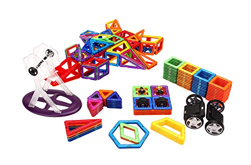 -. Feature : VARI ETY COLORS AND GEOMETRY SHAPES - 48 Squares, 24 Triangles, 6 large triangle, 10 rectangle, 4 Trapezoids, 2 hexagon, 2 wheel, 2 wheels, 2 Kids in squares, the ferris wheel kits, and a Model Booklet that guide kids to build different models that ensures continuously fun and sparking creative thinking / NO SAFETY WORRIES & BPA FREE - designed with high quality ABS plastic, BPA free, toxic free. Item is tested and approved for ages 3+, conform to CE, ASTM and EN71. Rounded edges with injured protect,5000 times falling-test approved magnet won't fall out to prevent Choking Hazard by contained small parts / MAGNET'S POWER AND MAGNETIC MAGIC - designed with Neodymium Rare-Earth Magnets which offer maximum magnetic power that allow your child to build the large structures with others shapes and enhance it with compatible accessories / INTELLIGENCE DEVELOPMENT & IMPROVE IMAGINATION - pretend play naturally provide opportunities for practicing different thinking skills, such as imitation, cause and effect, problem solving, symbolic thinking, others preschool abilities of building their own construction / STEM CONCEPT TRAINING AND EDUCATIONAL PLAY - colorful Geometric Shapes to help kids to improve Cognition, learning Basic Math and Science concepts, a capacity for Creative, Divergent thinking. Play group sessions encourage a child to test spatial relationships and mentally rotate objects in the mind's eye. Such practice might lead kids to develop superior spatial abilities
