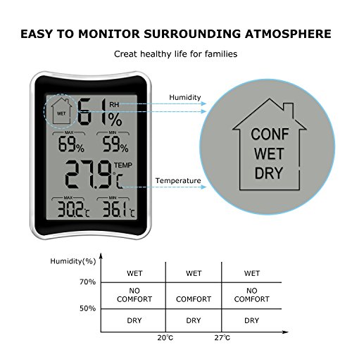 - The Indoor Thermometer and Humidity Monitor quickly indicates comfort temperature and humidity conditions on the large LCD display with the temperature and humidity level icon that shows current air conditions--DRY/COMFORT/WET, which indicates High/Ideal/Low Air Conditions in your room.