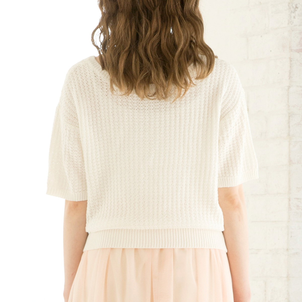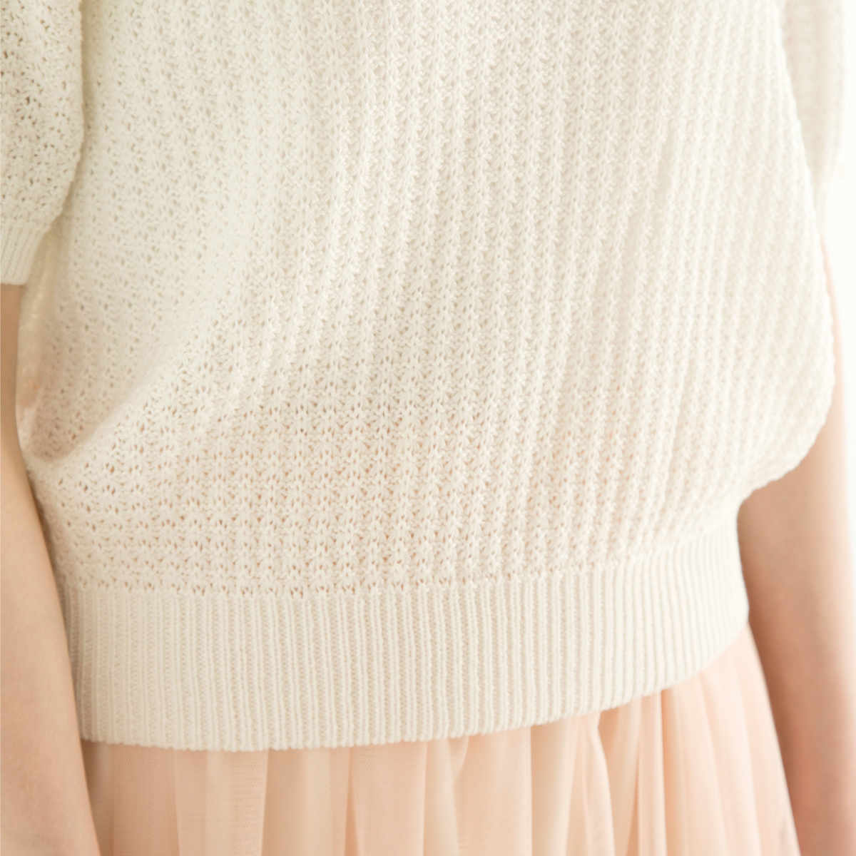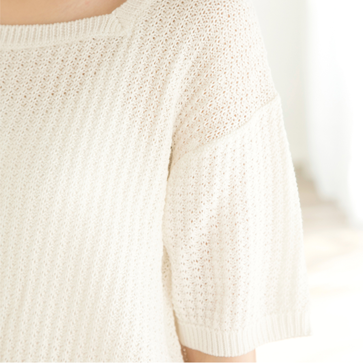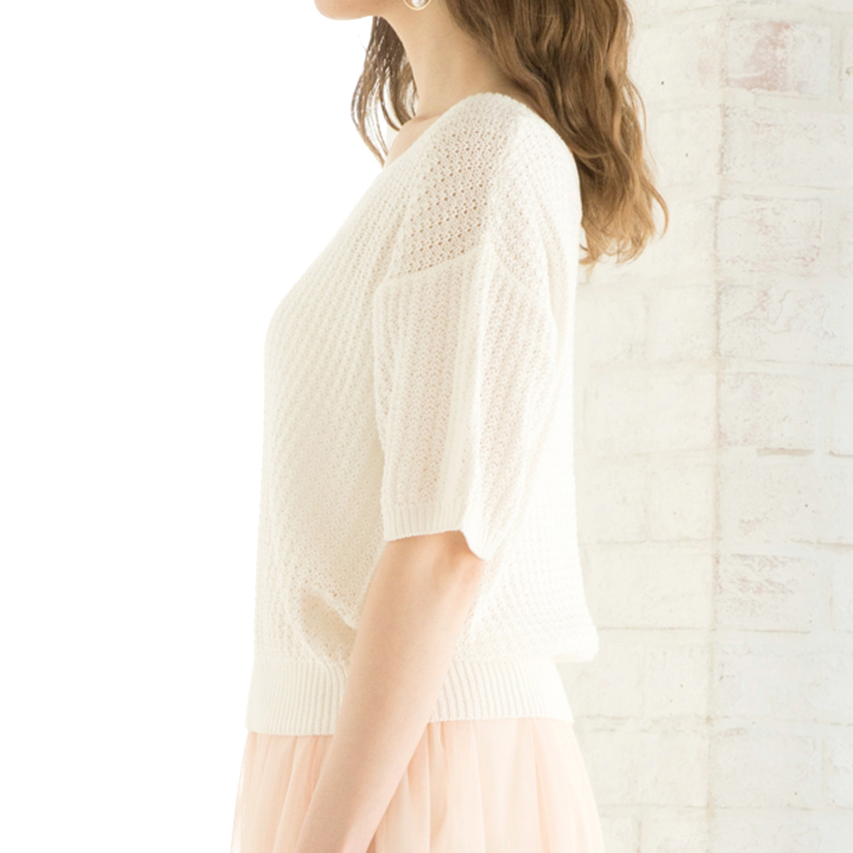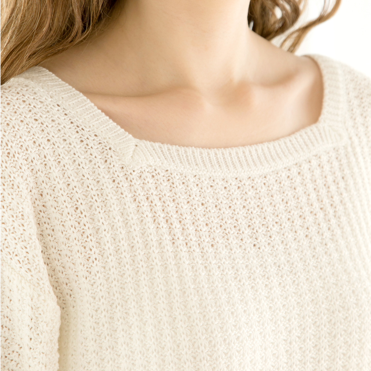 透かし柄編み素材を使用し、ニットでもカジュアルでフェミニンな印象に仕上げてくれます。ふんわりとしたシルエットで、春らしい優しい印象に。クルーネックとスクエアネックの2WAYで、ボトムスに合わせて顔まわりの雰囲気を変えて着られます。春先から真夏まで長く活躍してくれる1枚です。