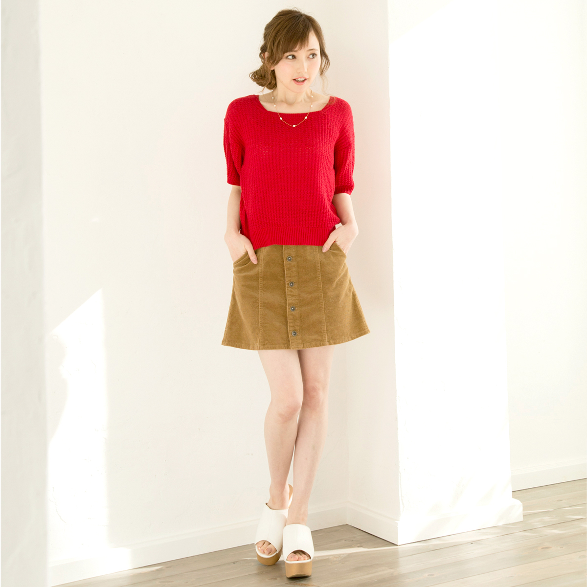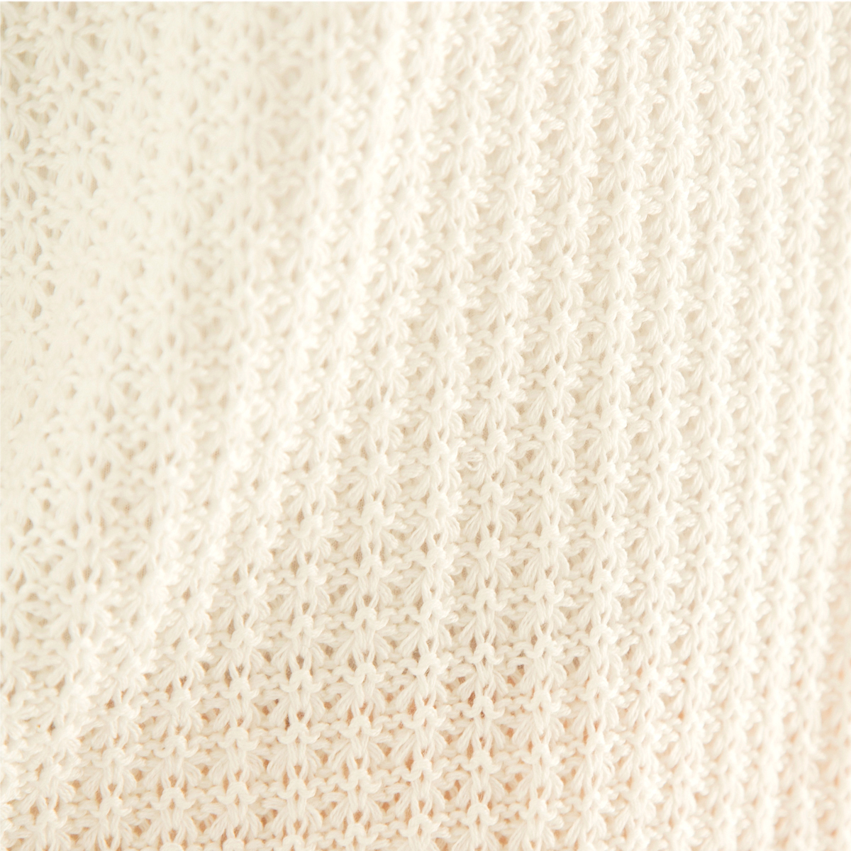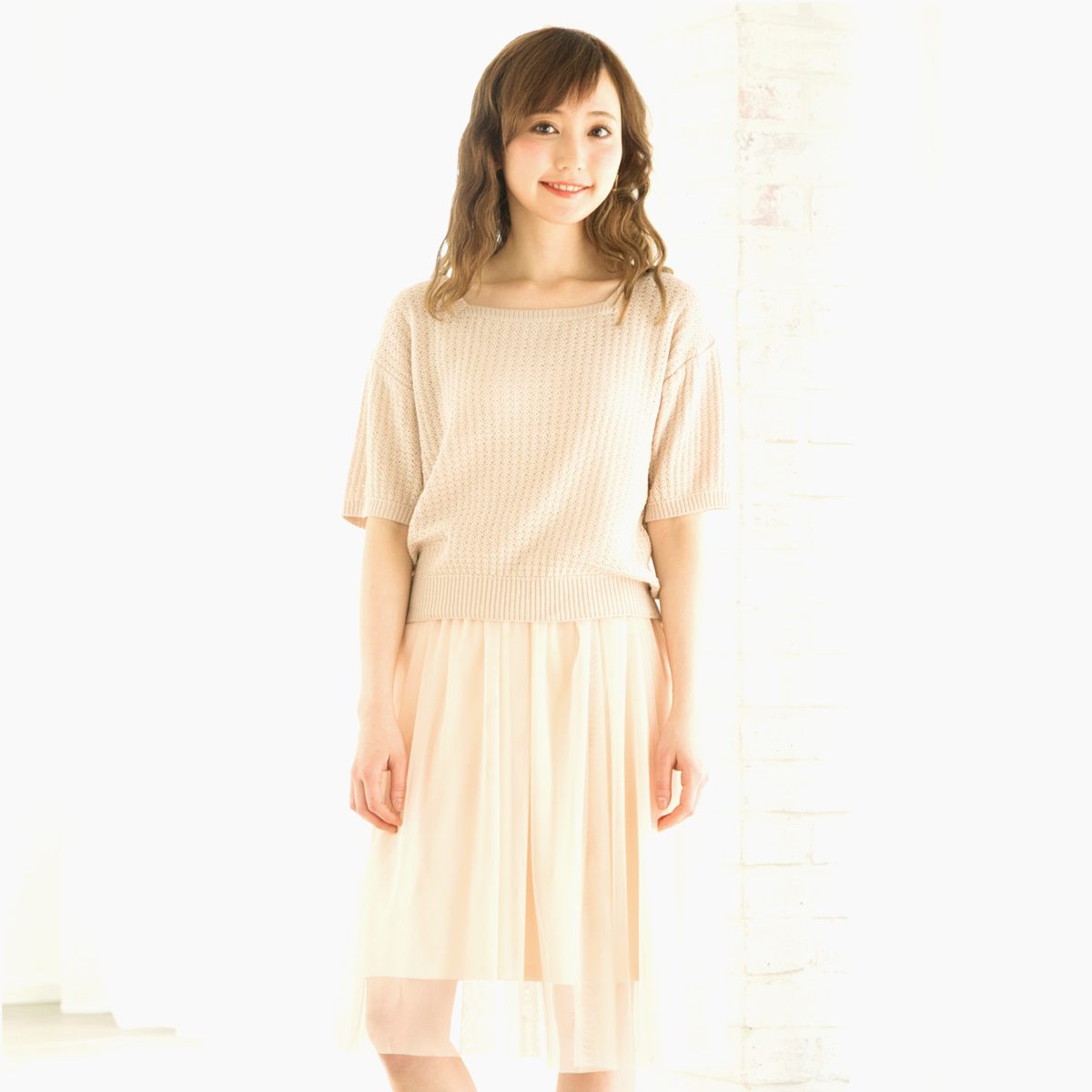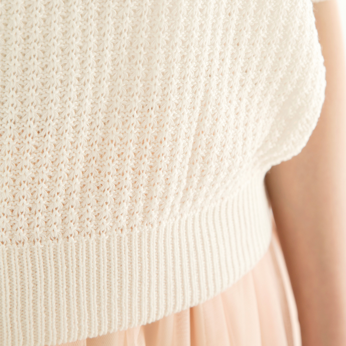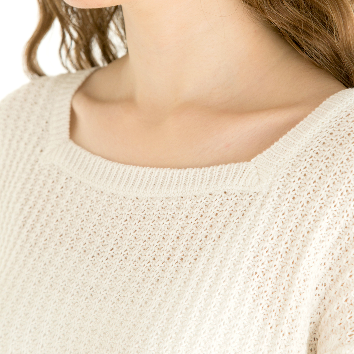 透かし柄編み素材を使用し、ニットでもカジュアルでフェミニンな印象に仕上げてくれます。ふんわりとしたシルエットで、春らしい優しい印象に。クルーネックとスクエアネックの2WAYで、ボトムスに合わせて顔まわりの雰囲気を変えて着られます。春先から真夏まで長く活躍してくれる1枚です。