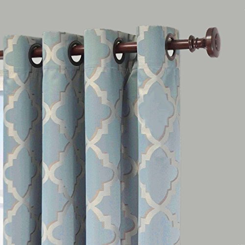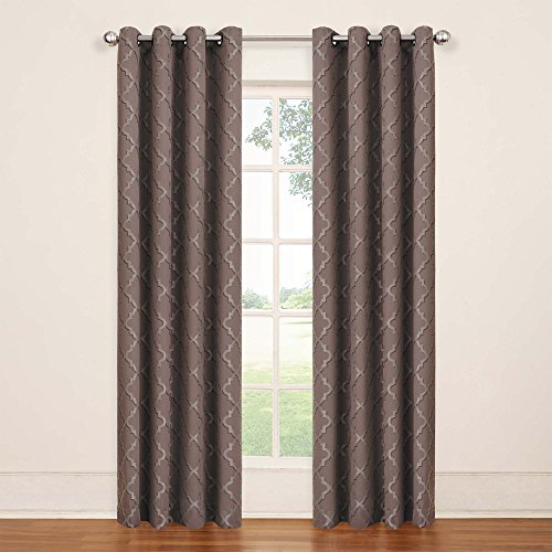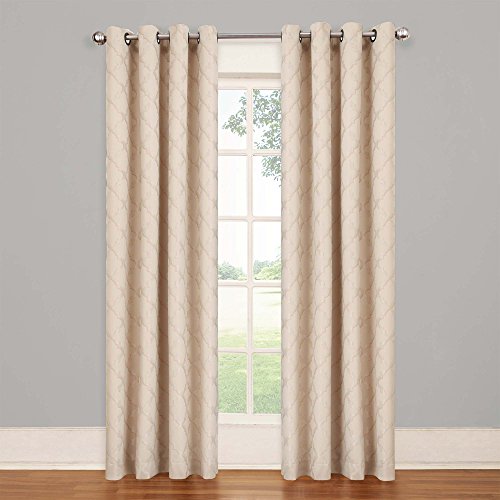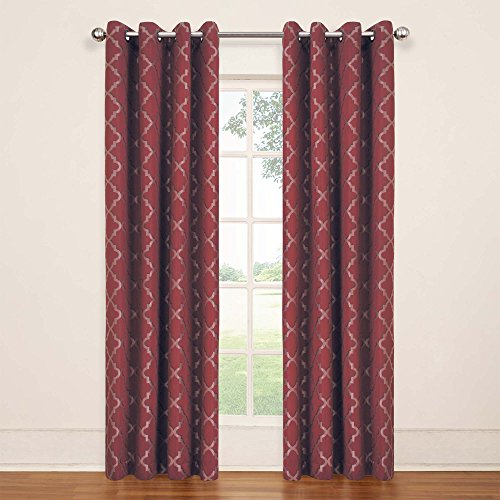 Transform any room in your home with the Eclipse Tipton Trellis blackout curtain. Independently tested, eclipse offers a superior blend of window fashion design and blackout technology for any decor. Update the bedroom, living room or dining room and enjoy the light blocking, noise reducing, energy-saving benefits of Eclipse. Perfect for daytime sleepers of all ages, home theater enthusiasts and energy saving conscious home owners, Eclipse curtains offer style versatility for any living space. The patented Thermaback process transforms ordinary drapery panels into a light-blocking, noise-reducing, energy saving solution for the home. The white, foam backing technology enhances any window treatment while allowing for the same drapability of naturally flowing curtains. Hang eclipse curtains in any bedroom to achieve an optimal sleeping environment. Each Eclipse Tipton Trellis grommet panel measures 52" wide by 84" long. Grommets are oil rubbed bronze in and color and measure 1.65 Inch and accommodate a 1 inch rod. Two-tone jacquard weave creates a high fashion trellis pattern and is available in ivory, mocha, blue and red. Curtain rod sold separately. Sold as a single panel. 100% Polyester. Machine wash gentle cycle, tumble dry, do not bleach. Imported.Feature