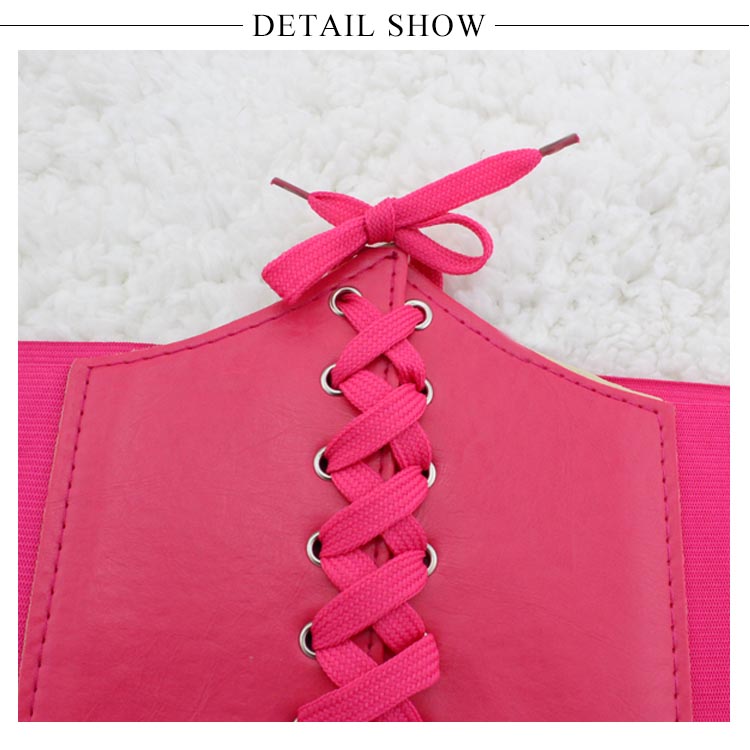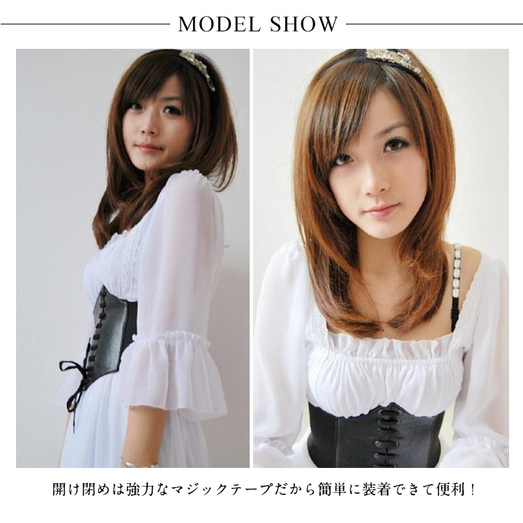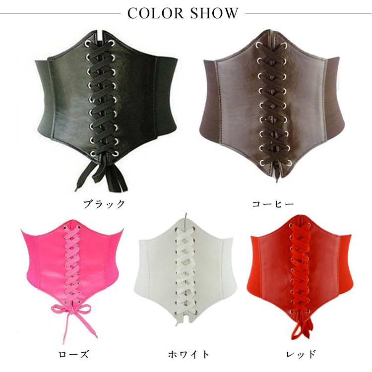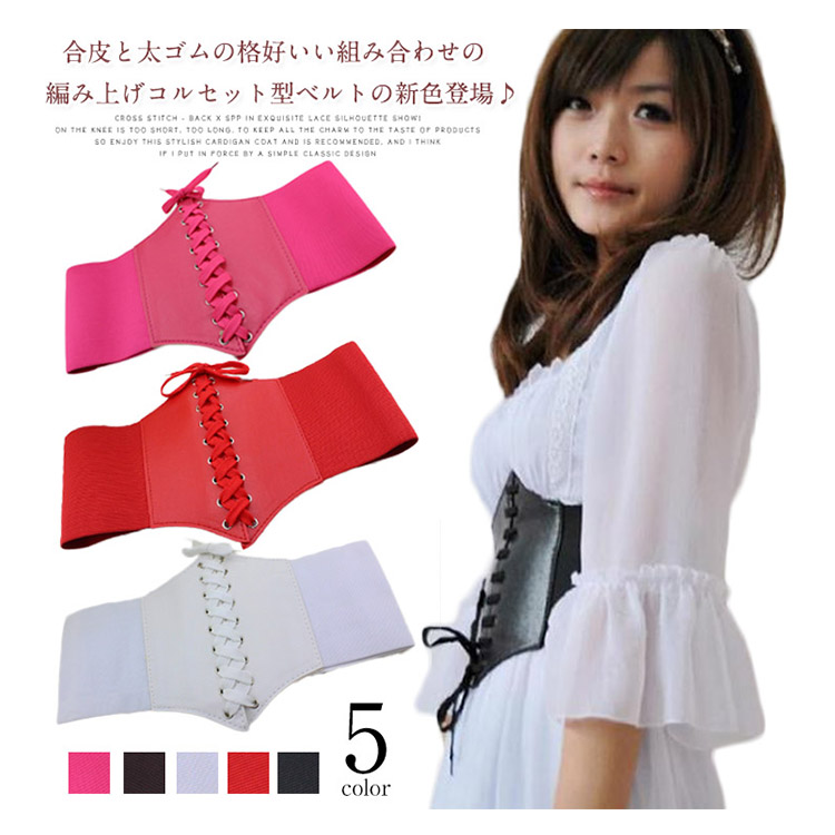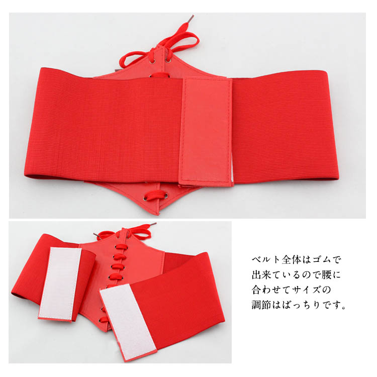 | 合皮と太ゴムの格好いい組み合わせの編み上げコルセット型ベルトの新色登場♪開け閉めは強力なマジックテープだから簡単に装着できて便利!ベルト全体はゴムで出来ているので腰に合わせてサイズの調節はばっちりです。ワンピースの上から着ければ美ライン効果もゲット!! | |