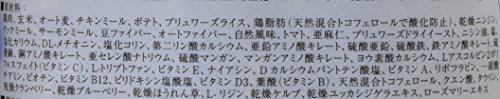 原材料:鶏肉、玄米、オート麦、チキンミール、ポテト、ブリュワーズライス、鶏脂肪(天然混合トコフェロールで酸化防止)、乾燥ニンジン、ダックミール、サーモンミール、豆ファイバー、オートファイバー、自然風味、トマト、亜麻仁、ブリュワーズドライイースト、ニシン油、塩、塩化カリウム、DL-メチオニン、塩化コリン、第二リン酸カルシウム、亜鉛アミノ酸キレート、硫酸亜鉛、硫酸鉄、鉄アミノ酸キレート、硫酸銅、銅アミノ酸キレート、亜セレン酸ナトリウム、硫酸マンガン、マンガンアミノ酸キレート、ヨウ素酸カルシウム、Lアスコルビン2ポリフォスフェイト(ビタミンC)、L-トリプトファン、ビタミンE、ナイアシン、Dカルシウムパントテン酸塩、ビタミンA、リボフラビン、一硝酸チアミン、ビオチン、ビタミンB12、ピリドキシン塩酸塩、ビタミンD3、葉酸(ビタミンB)、天然混合トコフェロール、クエン酸、タウリン、乾燥クランベリー、乾燥ブルーベリー、乾燥ほうれん草、L-リジン、乾燥ケルプ、乾燥ユッカシジゲラエキス、ローズマリーエキス