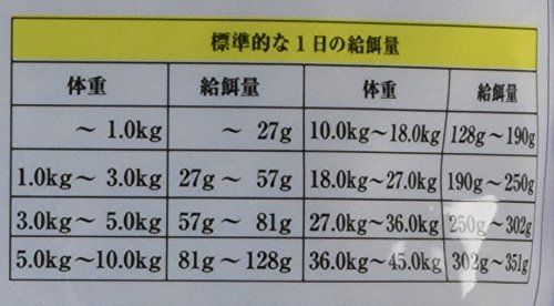 素材構成:粗蛋白質…23%以上、粗脂肪…13%以上、粗繊維質…3%以下、水分…10%以下、カルシウム…1.2%以上、リン…1%以上、タウリン…0.05%以上、アスコルビン酸(ビタミンC)…20mg/100g以上、EPA&DHA…0.25%以上、オメガ3…0.4%以上、オメガ6…2.5%以上