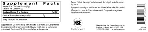 -. Feature : Supports energy production to maintain and promote lean body mass, muscle endurance, and power output / Supports energy production / Maintains and promotes lean body mass, muscle endurance, and power output / Easy-to-mix, highly-researched form of creatine known as Creapure® / Thorne products contain ingredients from the purest sources worldwide. Flavors, colors, preservatives, and sweeteners derived from natural sources. Our products never contain gluten, Genetically Modified Organisms (known as GMOs), artificial preservatives, stearates, wheat, rye, barley, eggs, or nuts. This product does not contain dairy, soy, corn, yeast, sugar, or magnesium stearate. This product is NSF Certified for Sport.