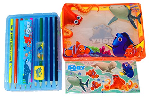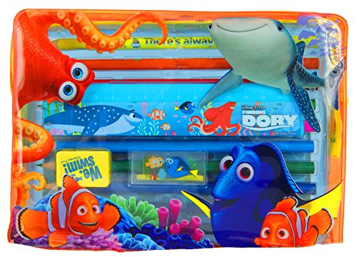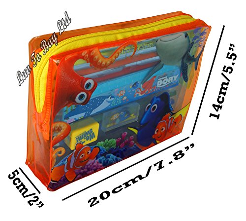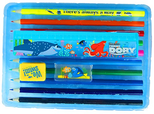 - Pencil case includes: 10 colouring pencils, 2 sticker sheet, 1 rubber, 1 pencil sharpener, 1 ruler, • Front graphics of different Finding Dory characters on front of clear pencil case • Single zip fastening • Suitable to hold crayons, markers, pens and other stationery essentials • Surface washable