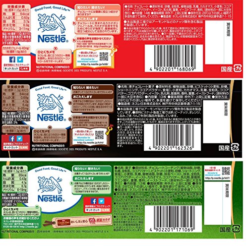 原材料:キットカットミニ:砂糖、全粉乳、植物油脂、乳糖、カカオマス、小麦粉、ココアバター、ココアパウダー、イースト、乳化剤、重曹、イーストフード、香料、(原材料の一部に大豆を含む)キットカットオトナの甘さ:植物油脂、砂糖、ビスケット(小麦粉、砂糖、ショートニング、ココアパウダー、食塩)、小麦粉、カカオマス、乳糖、全粉乳、ココアバター、ココアパウダー、イースト、乳化剤、膨脹剤、香料、重曹、イーストフード、(原材料の一部に大豆を含む)キットカットミニ抹茶:チョコレートング(植物油脂、砂糖、乳糖、全粉乳、ココアバター)、ビスケット(小麦粉、砂糖、ショートニング、食塩)、小麦粉、乳糖、植物油脂、砂糖、抹茶ペースト、抹茶、全粉乳、ココアパウダー、イースト、カカオマス、ココアバター、乳化剤、膨脹剤、クエン酸K、重曹、香料、イーストフード、(原材料の一部に大豆を含む)