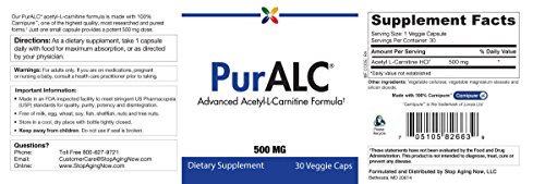 Acetyl-L-carnitine (ALC) is an amino acid that provides fuel for cellular energy production. It helps control enzymes that keep the cell's energy centers, called mitochondria, stocked with fuel. Research shows that blood levels of acetyl-L-carnitine steadily decline after age 40 in humans. Lacking ALC, your cells' mitochondria don't burn as brightly or as robustly, triggering a massive but gradual "brown out" that hits billions of cells simultaneously. Understandably, this prompts a slowdown in the body's mental and physical activity, which is a hallmark of aging. We highly recommend our PurALC formula for anyone who feels as if they have lost mental and physical energy, especially since side effects are virtually non-existent. Research has shown that ALC, a cousin of the L-carnitine commonly sold as a body-building supplement, is far more biochemically powerful in controlling damage to, and revitalizing, mitochondria. Our premium grade PurALC is made with 100 percent Carnipure Acetyl-L-Carnitine, one of the highest quality, most researched and purest forms available. Carnipure is the only form of ALC produced using a unique fermentation-based process which mimics the way ALC is produced in nature, and PurALC provides a potent clinical dose of 500 mg per daily dose.Feature